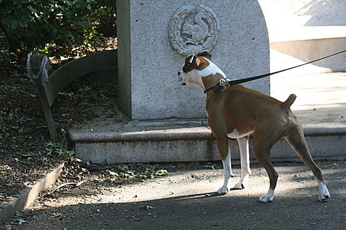 松鼠專心吃東西 路過的狗專心的看著松鼠 而一堆人專心看著這有趣的畫面 三分鐘後松鼠才發現旁邊的狀況 嚇一跳 跳得老高 狗狗也被松鼠突然的動作嚇到 旁邊一堆人都笑歪了