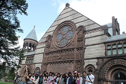 三位美女身後的門是普林斯頓的大門(其實一點都不大),原本都是關起來的,只有新生入學時跟學生畢業時才會打開,但在1960年代的學生運動中校方應學生要求不應限制進出的自由,而保持隨時打開的情況下,學生反而不願意從此門進出,據說是為了不想"提早畢業"啦,頭上的小虎是普林斯頓的吉祥物,校服上都有的標誌。最後還因為曬太陽變得像斑馬,YUNG大哥戲稱為豬腳。