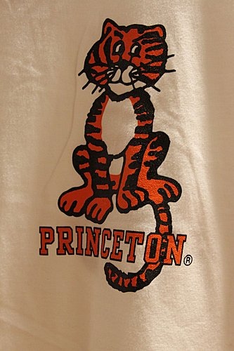 三位美女身後的門是普林斯頓的大門(其實一點都不大),原本都是關起來的,只有新生入學時跟學生畢業時才會打開,但在1960年代的學生運動中校方應學生要求不應限制進出的自由,而保持隨時打開的情況下,學生反而不願意從此門進出,據說是為了不想"提早畢業"啦,頭上的小虎是普林斯頓的吉祥物,校服上都有的標誌。