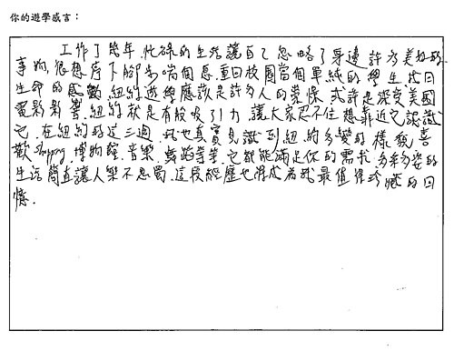 工作了幾年,忙碌的生活讓自己忽略了身邊許多美好的事物,很想停下腳步喘個息,重回校園當個單純的學生,找回生命的感動,紐約遊學應該是很多人的憧憬,或許是深受美國電影影響,紐約就是有般吸引力,讓大家忍不住想靠近它、認識它,在紐約三週,我也真實見識到紐約多變的樣貌,喜歡Shopping、博物館、音樂、舞蹈等等,它都能滿足你的需求,多采多姿的生活簡直讓人樂不思蜀,這段經歷也將成為我最值得珍藏的回憶。