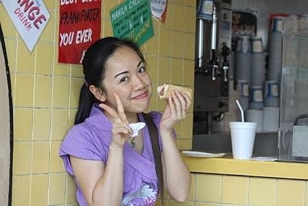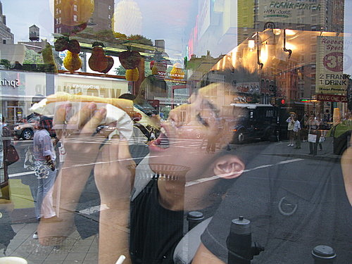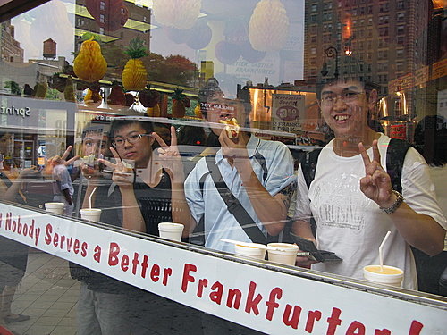 上一篇吃完了cheese cake,現在來吃hot dog,便宜又好吃的hot dog,先看一下它的官網http://www.grayspapaya.com/(官網目前under construction,有空再回來看吧!不然看看Wikipedia的介紹吧!! http://en.wikipedia.org/wiki/Gray%27s_Papaya ),這家熱狗店可是一天到晚都在電視電影裡看到的店,歐巴馬總統競選時也張大口吃的熱狗也是來自這家店,一進去雖不豪華,卻覺得心情愉悅,天花板掛滿了各式各樣colorful的水果彩球,菜單也貼大大的彩色海報,重點是還要站著吃,沒有位子喔~~來個SET套餐,兩條熱狗+一杯水果汁(經典是PAPAYA),熱狗加上滿滿的酸菜,超清爽,而且不像傳統速食店,搭配可樂汽水,吃完覺得心情罪惡,體重上身