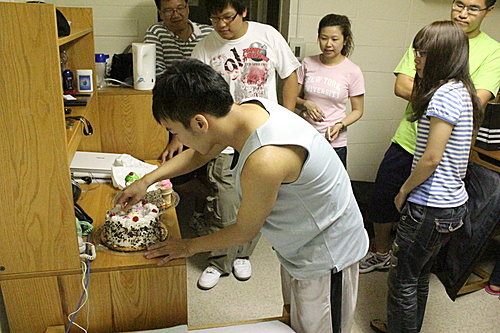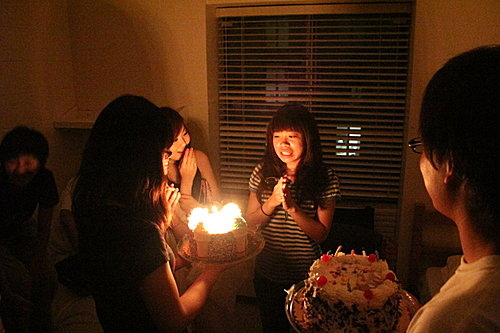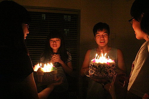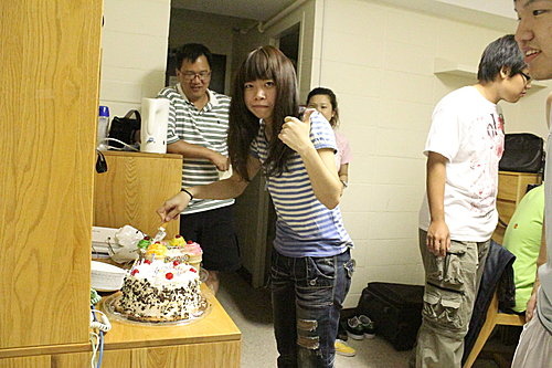 不斷有人敲門,團員們進出頻繁,我們也一直不斷的嚇唬壽星,可憐小壽星一直被蒙在鼓裡,如坐針氈,就在一陣急促而猛烈的拍門聲音響起,此時突然停電,尖叫聲中同學們端進兩個點燃蠟燭的蛋糕大家唱起生日歌,