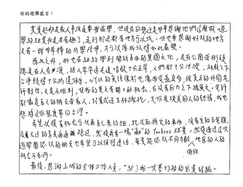 除此之外,我也在紐約學到開放自由的異國文化,走在公園或街頭總是有人在表演,路人常常邊走邊唱歌十分正常,人們都十分活潑,相較之下台灣顯得十分拘謹保守。NYU的英語課程也讓我受益良多,跟真正的外國老師對話,又是小班制,使我的英文有開口說的機會,在沒有壓力之下練英文。老師都像自己的朋友或家人,結業是還互相擁抱,充分展現美國人的熱情,我也想將這份態度帶回台灣。